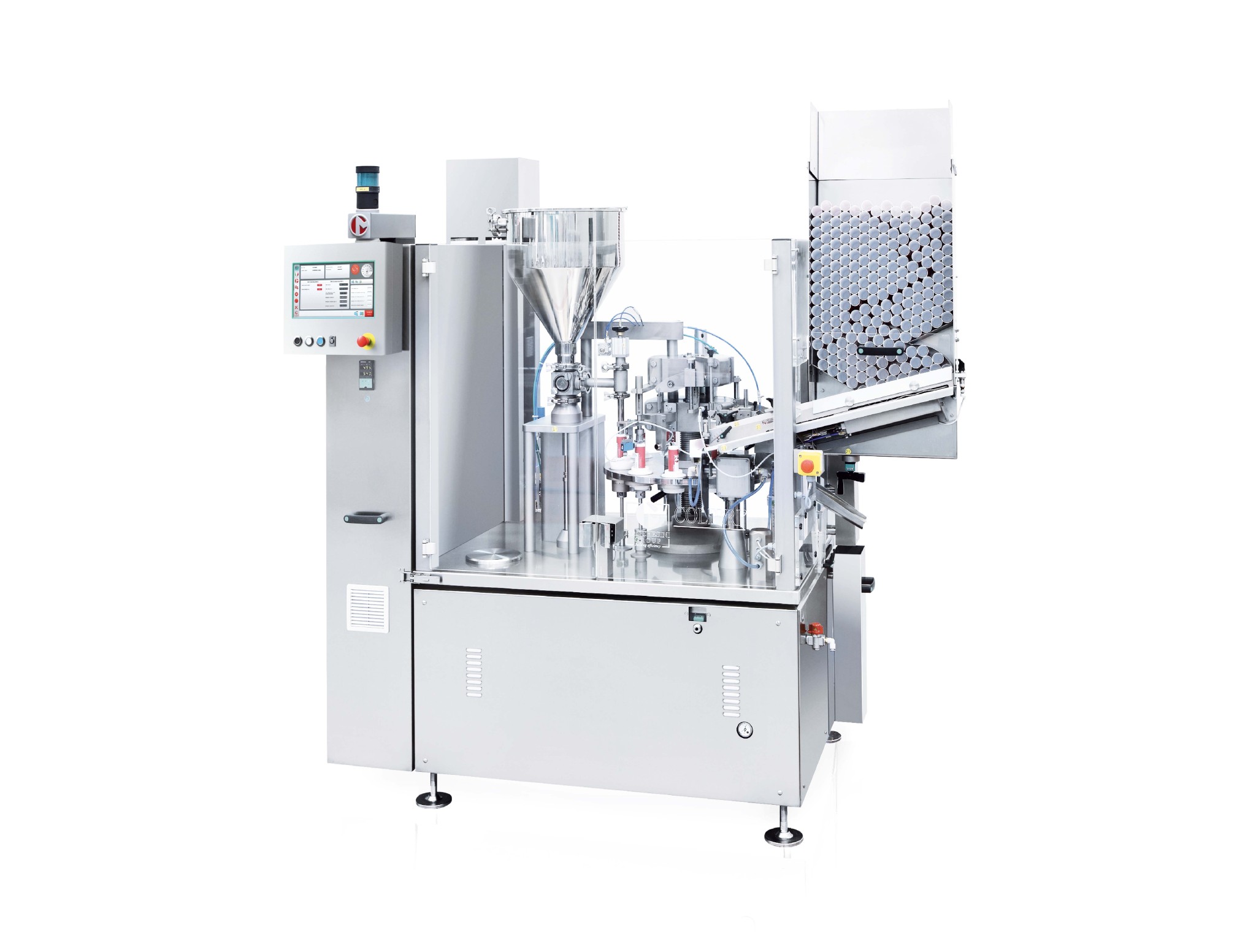 Intermittent motion rotary automatic machine for filling and sealing metal, polyethylene and laminate tubes.