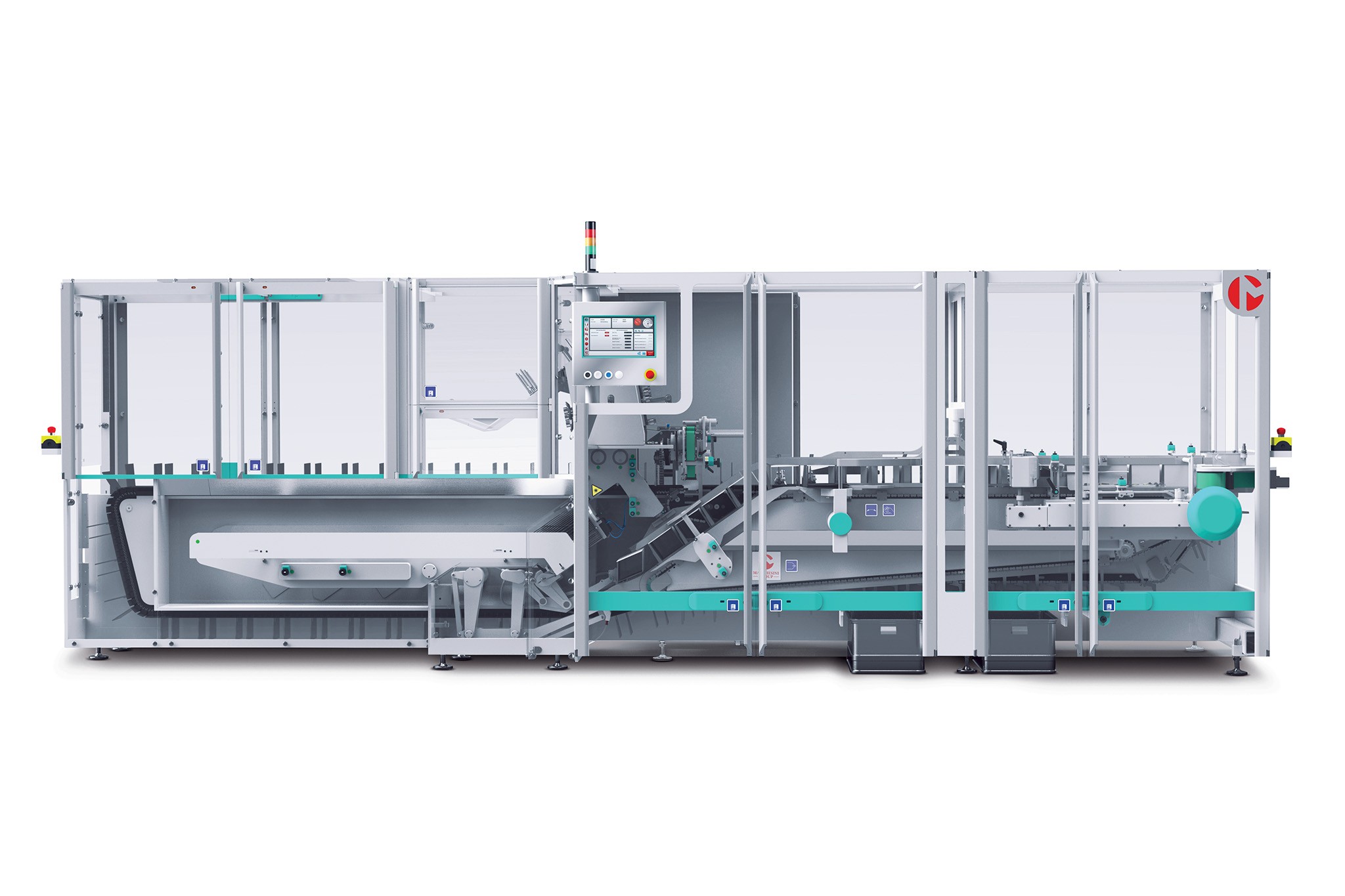 Continuous motion, medium-speed, horizontal cartoning machines particularly suitable for packing large tray formats, vials, bottles and stacked blister.