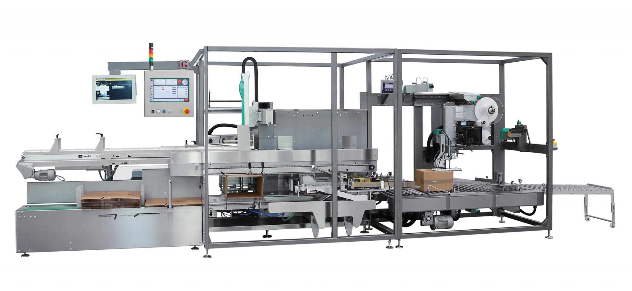 Automatic machine for packing single cartons or bundles into cases, closed with adhesive tape or glue. The machines comes fully equipped for serialization and data aggregation (Track&Trace), is controlled by servo-driven motors and PC-managed.