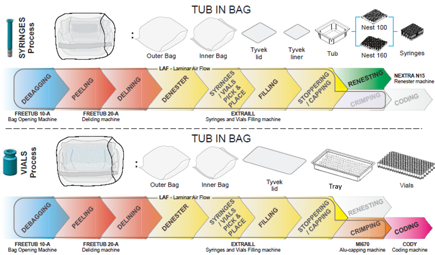 The first machine, FREETUB 10-A, cuts the bag and feeds the sterile tub to the filling room. It is expected to operate into a Grade C room.