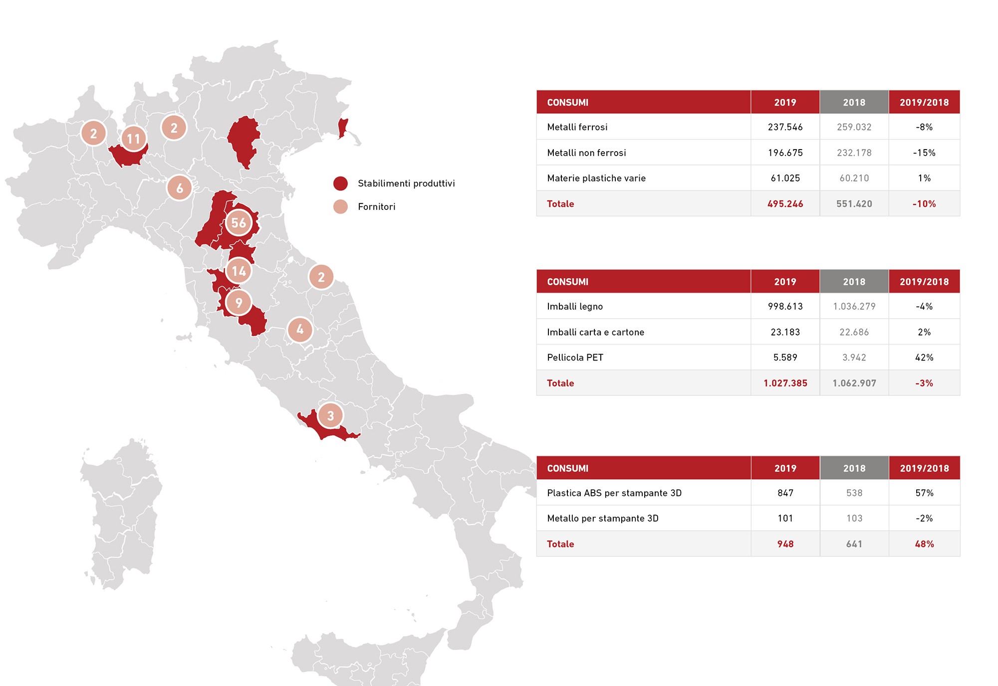 Nel 2019 il consumo di materiali grezzi ha subito una diminuzione dei consumi dovuta al calo di produzione della divisione Neri. Tuttavia è noto che i consumi storicamente non sono mai stati costanti ma sono sempre stati caratterizzati da un andamento sinusoidale.
