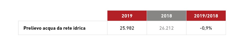 Nel 2019, la quantità di acqua prelevata è pari a 25.982 m3, sostanzialmente invariata rispetto al 2018. Questo, nonostante l’incremento dei dipendenti e della superficie occupata dall’Azienda, è dovuto ad una riduzione delle perdite nella rete idrica e dell’irrigazione delle aree.
