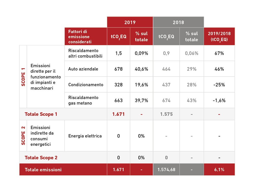 Dal momento che la quantificazione delle emissioni appartenenti a quest’ultima categoria attualmente non è obbligatoria, ma a discrezione dell’azienda, l’indagine è stata circoscritta agli scope 1 e 2 per i quali i dati attività sono stati determinati sulla base delle informazioni contenute nelle bollette delle utenze o dalle carte carburante per i consumi di carburante dei mezzi di proprietà aziendale.
