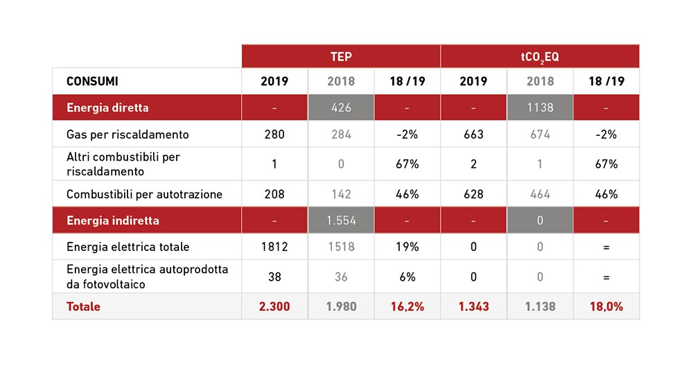 I consumi energetici totali in termini di tep (tonnellate equivalente di petrolio) nel 2019 sono aumentati del 16,2% circa, come conseguenza all’aumento dei consumi di energia elettrica dovuto all’aumento della produzione, dei dipendenti, della flotta di auto aziendali (e del loro utilizzo) e del gas per riscaldamento dovuto all’aumento dell’estensione degli stabilimenti.