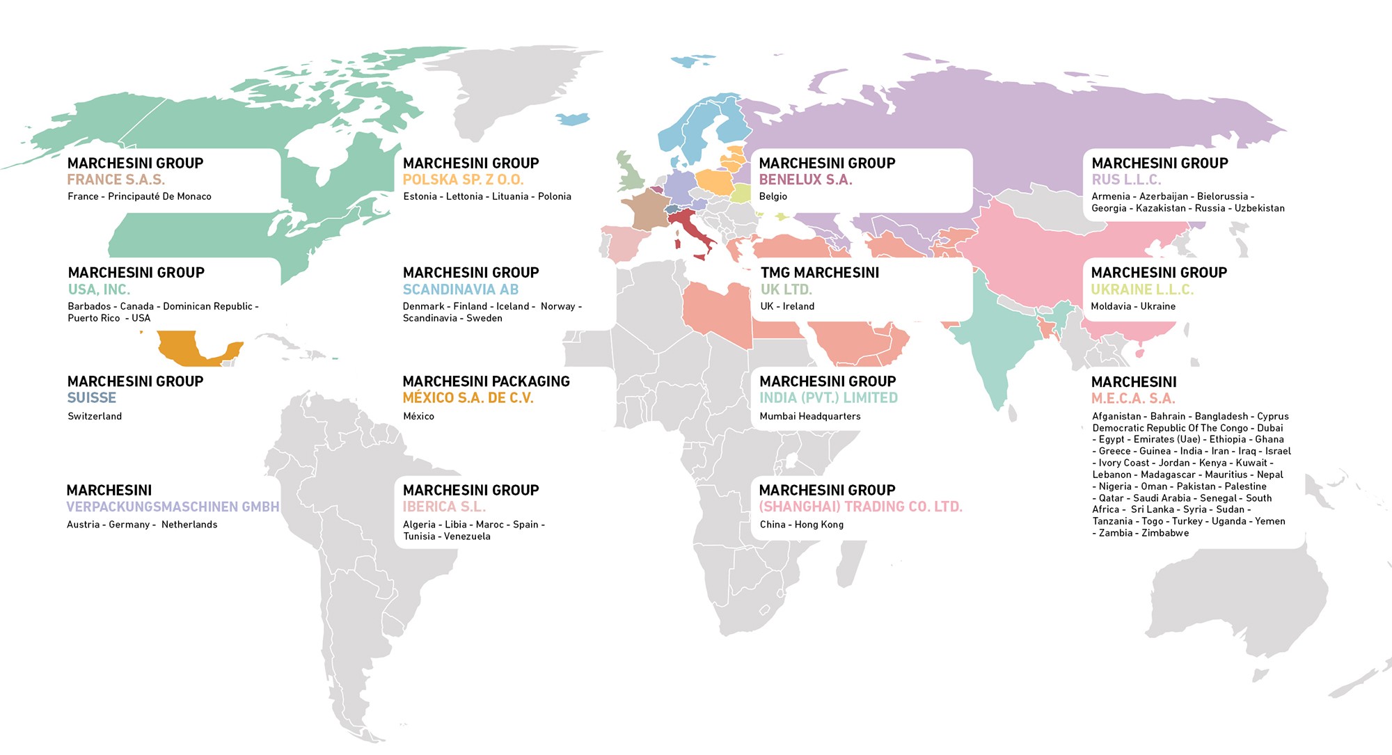Con una percentuale di esportazioni che si aggira stabilmente intorno all’85% del fatturato, Marchesini Group è un’azienda a fortissima vocazione internazionale. Per tenere alto questo ruolo e consolidare la sua presenza nel mondo, sin dai primi anni di attività Marchesini ha puntato sulla creazione di una capillare rete commerciale all’estero.