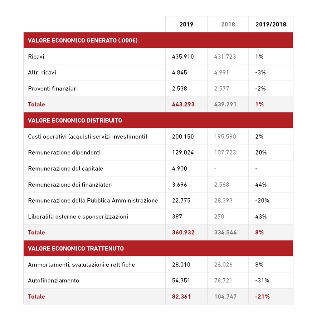 • liberalità, contributi associativi e sponsorizzazioni alla comunità sono stati pari a circa 387mila euro (7% rispetto al 2018).