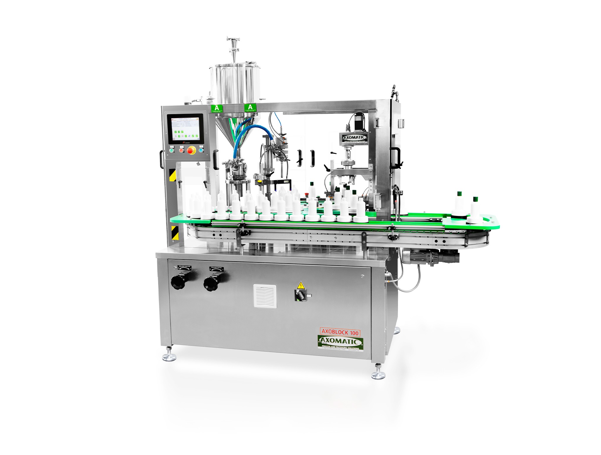 Macchina automatica per il riempimento e tappatura a movimento alternato per flaconi stabili e non stabili in boccole, per prodotti liquidi e cremosi.