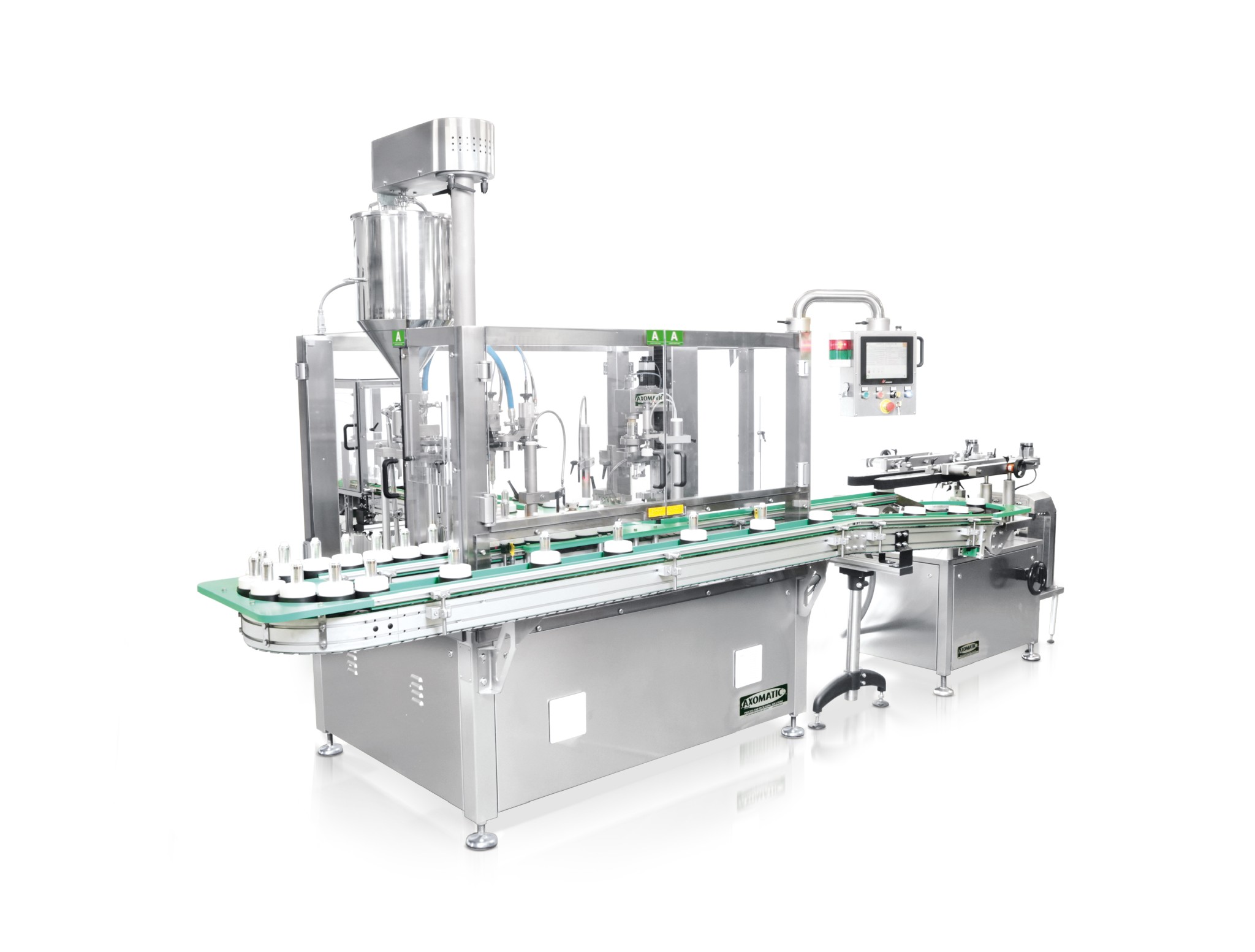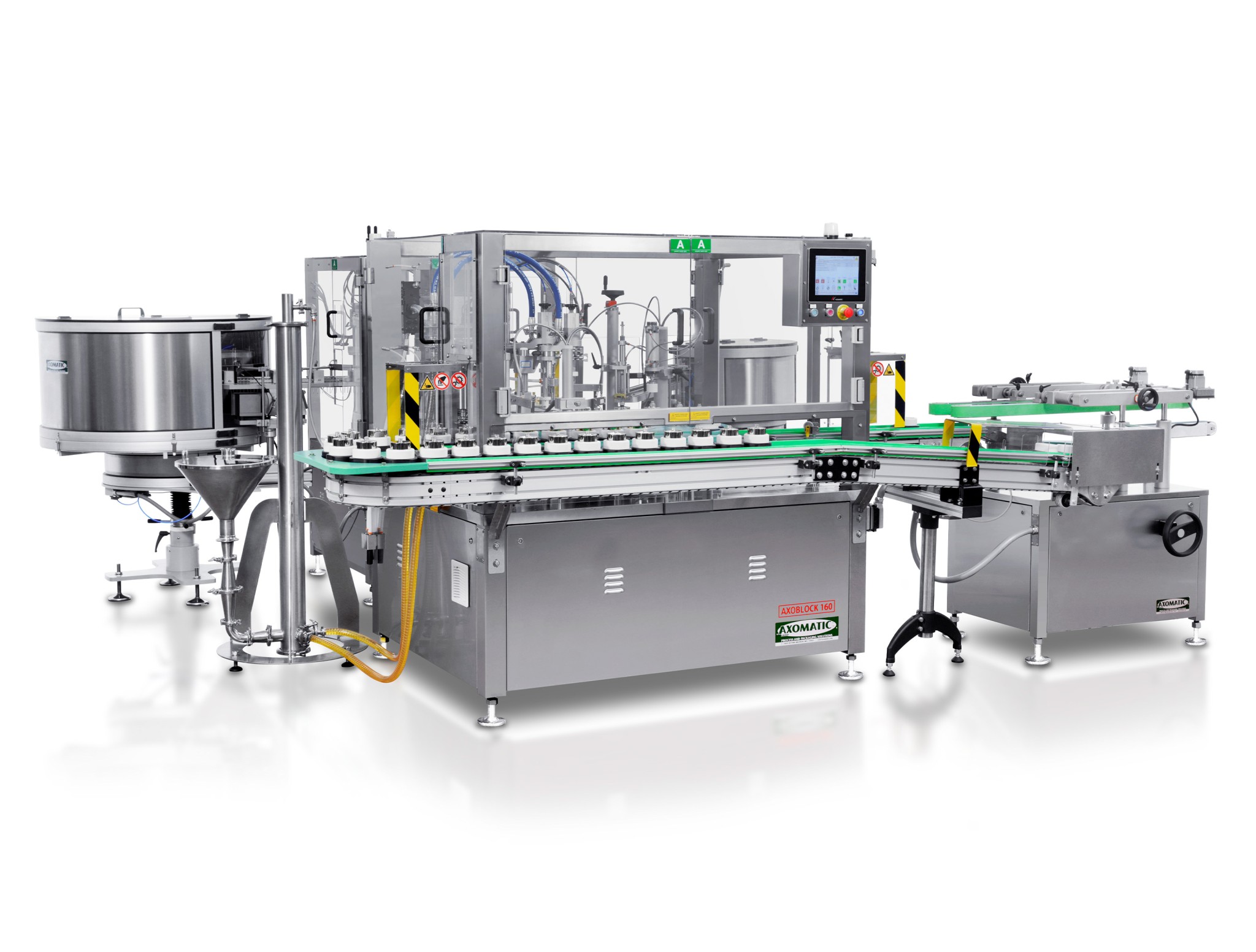 Riempitrice e tappatrice automatica a movimento alternato per flaconi stabili in boccole per profumi, prodotti liquidi e cremosi.
