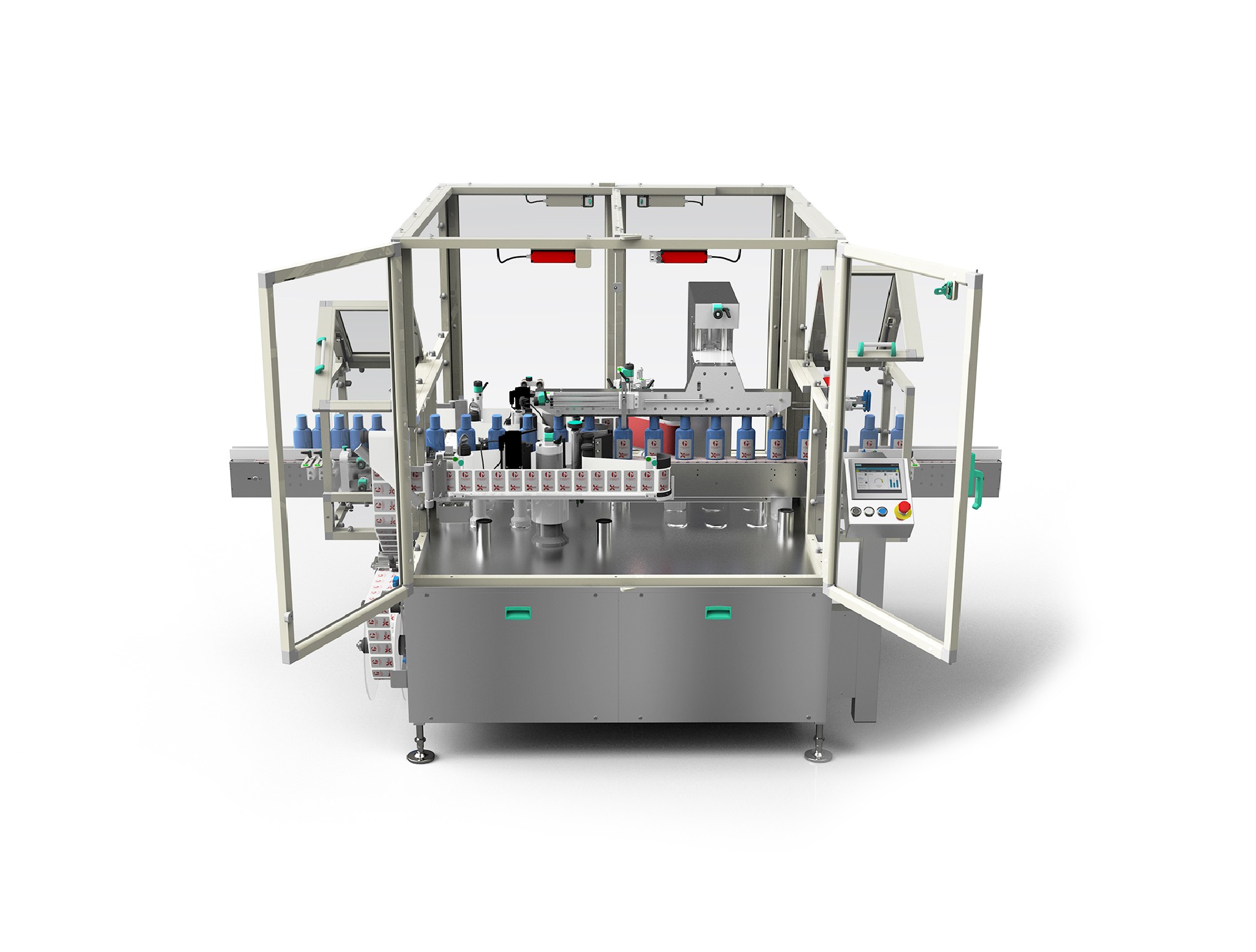 Etichettatrice automatica per etichettatura singola o doppia a velocità medio-bassa per flaconi, fiale e contenitori ovali, rettangolari e tondi.