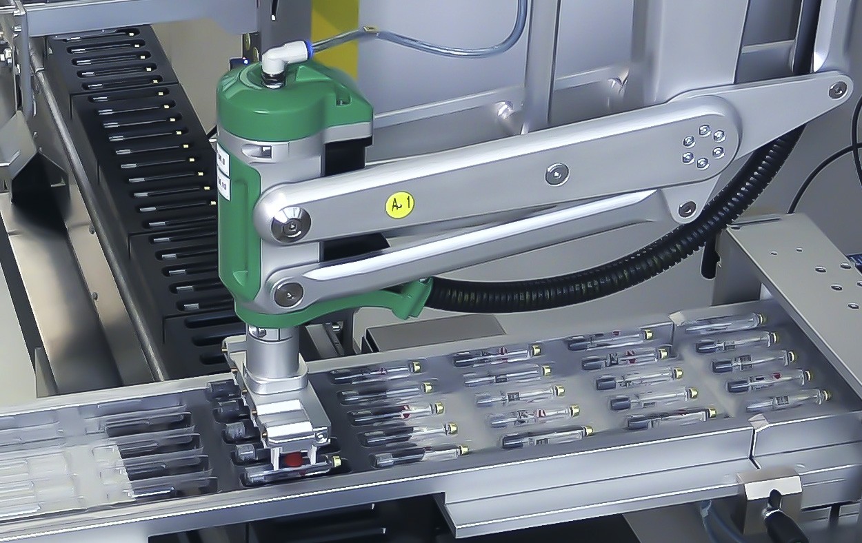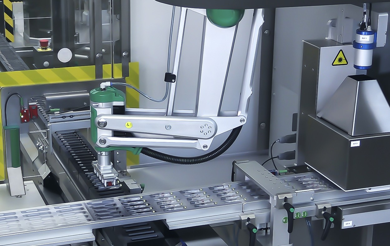 Il ciclo di confezionamento inizia con la NextraN10, responsabile del de-nesting delle siringhe, seguita dalla Combi 2PL, deputata al loro assemblaggio ed etichettatura. Entrambe queste soluzioni sono targate Corima, che quest’anno ha supportato big pharma con la realizzazione di linee per il confezionamento di vaccini anti-Covid. Combi - una delle migliori soluzioni sul mercato per l’assemblaggio siringhe e applicazione Safety Devices - monta a bordo in questo caso due alimentazioni separate: una per le siringhe, l’altra per le carpule.
