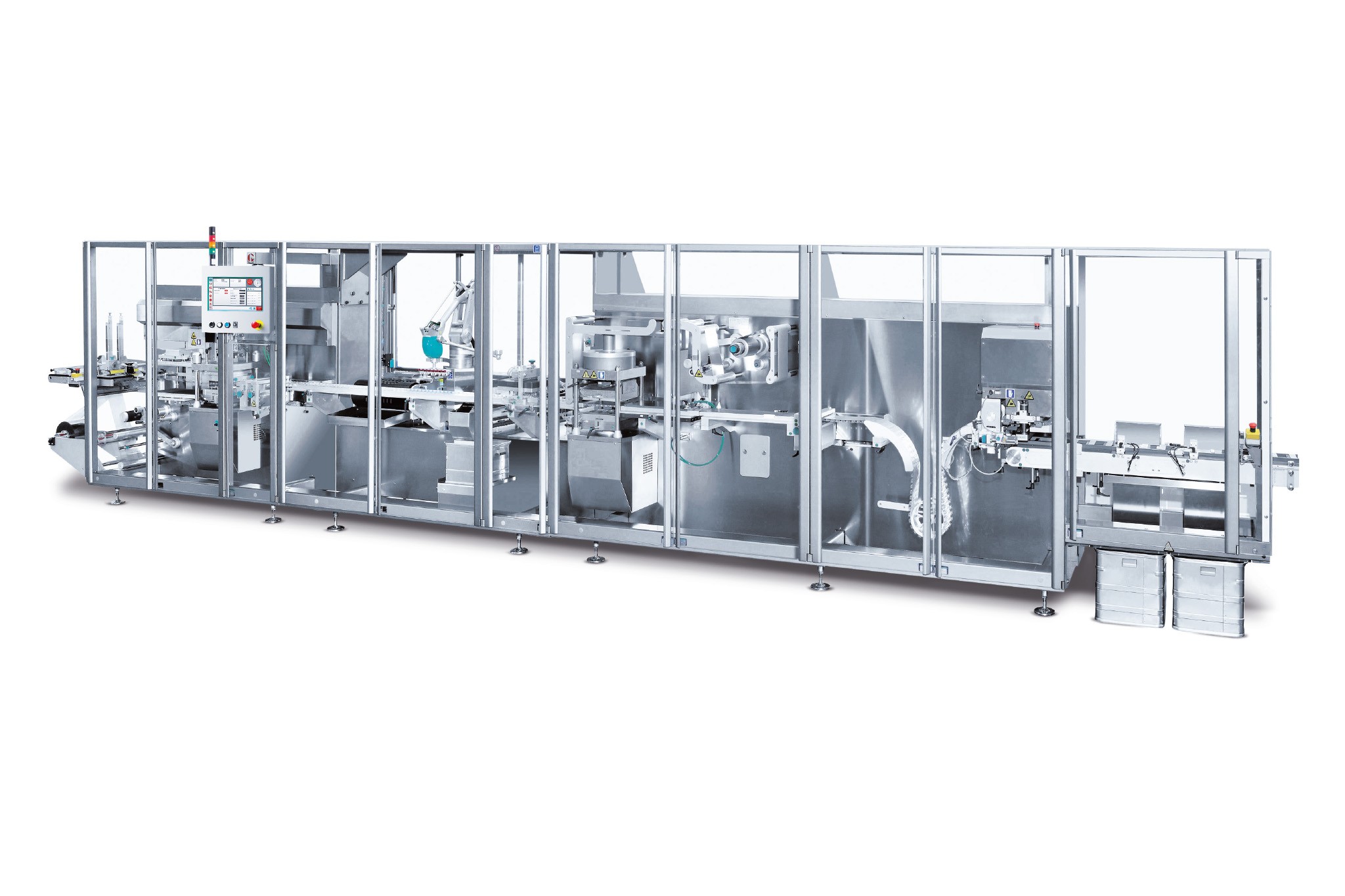Movimento meccanico intermittente, con struttura di supporto a balcone, stazioni indipendenti servoassistite, finitura in acciaio inossidabile.