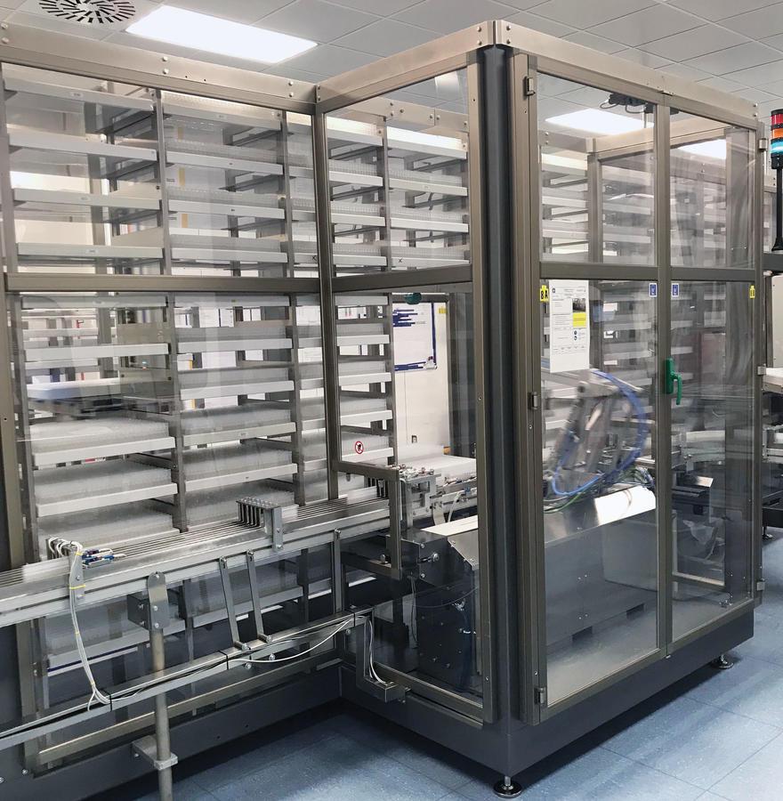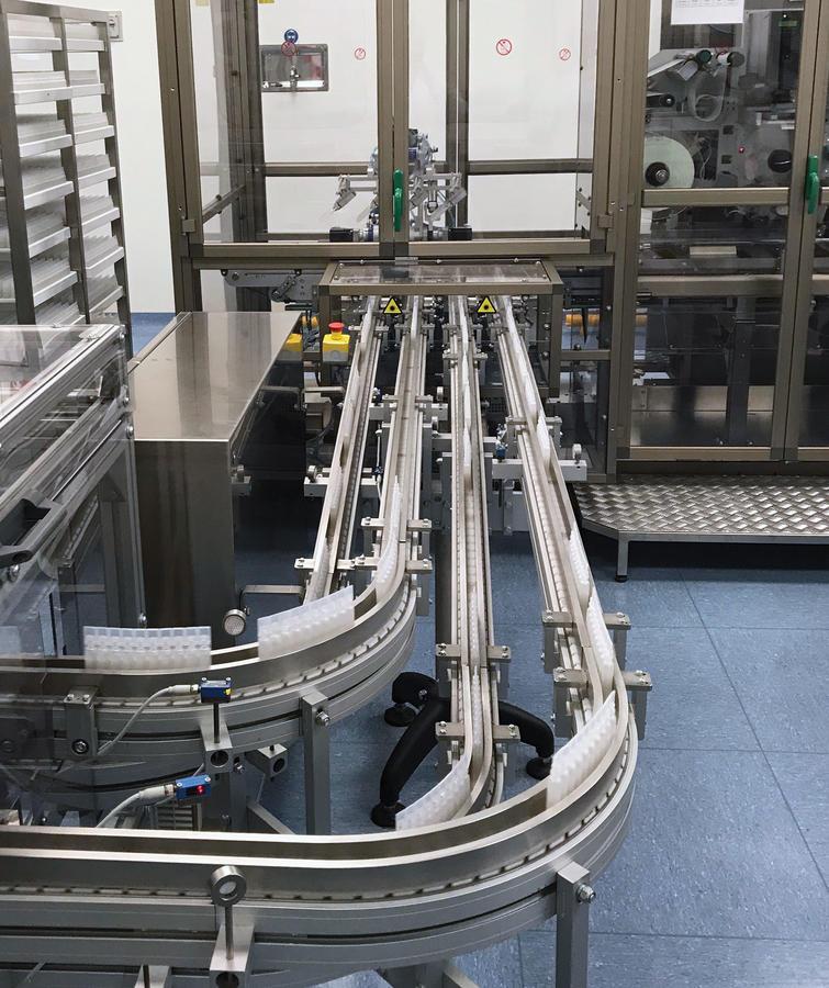 According to Luca Angelini, Technical & Information Services Manager at Sanofi, the Marchesini packaging line became necessary in 2016 when the third and fourth Rommelag systems were added. Soon, he adds, a fifth and sixth BFS BP 460 will be installed along with a new Marchesini line that will replace an existing packaging line that dates back to 2007. For now, the 2016 line accepts the output of all four Rommelag machines. Since each of these blow/fill/seal systems is capable of 20,000 individual bottlepacks/hr, the Marchesini equipment has to be mighty capable, to say the least. Helpful, as we’ll see in a minute, is a clever buffering system at the very beginning of the 2016 line, which is the line we’ll look at in this story.