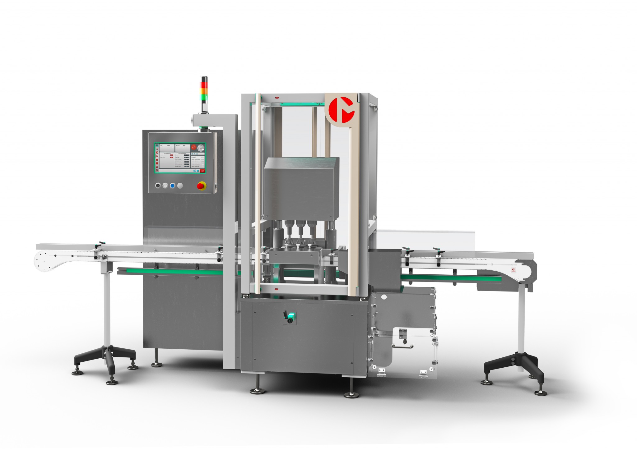 Macchina automatica in linea, a movimento alternato, senza impianto elettrico e PC, perché gestita da macchina a monte o a valle in funzione della configurazione di linea, adatta a riavvitare tappi sui flaconi in uscita dalla stazione di saldatura a induzione hot foil.