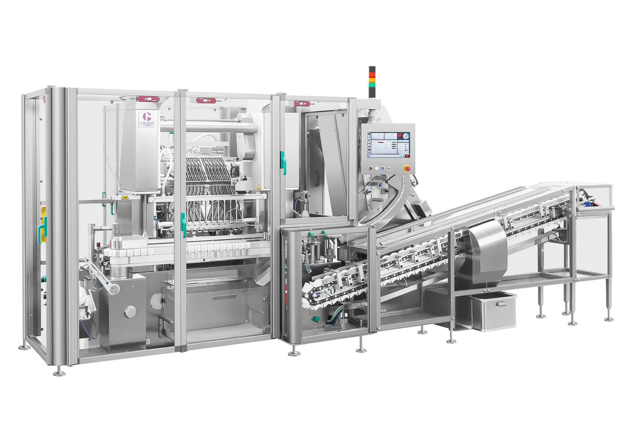 Riempitrice e chiusura automatica di tubi rigidi, adatta per contare e introdurre positivamente compresse in tubi rigidi di plastica o metallici, di forma cilindrica.