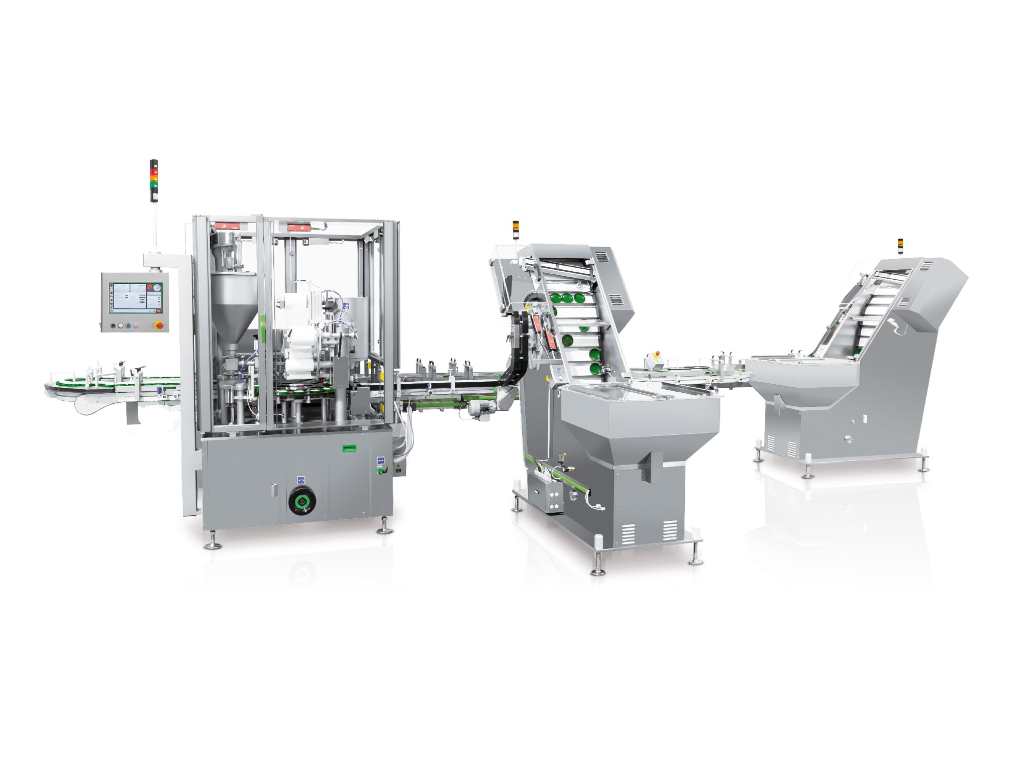 Macchina automatica a movimento intermittente per il riempimento e la tappatura di vasetti di platica o vetro per creme gel o prodotti liquidi.